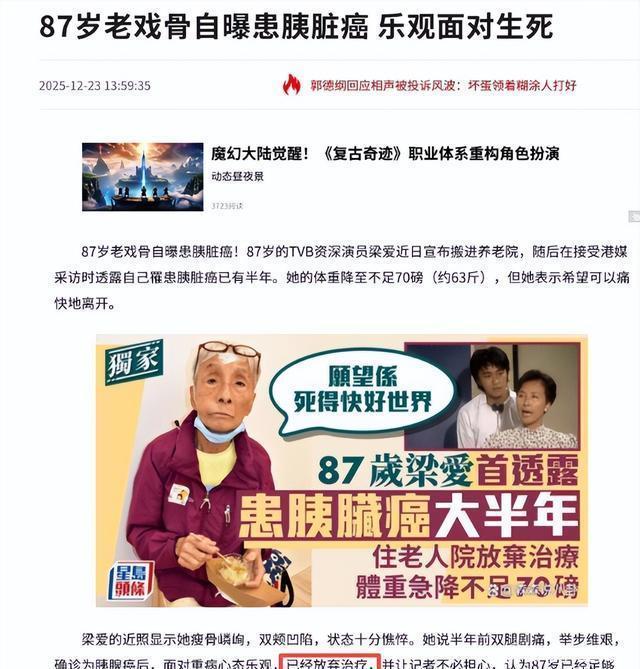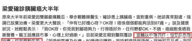 说实话,这样的事情,但凡放在其他人的身上,说不定早已崩溃了。崩溃后,就会想各种方法治疗。 可是,梁爱却表现得很豁达,表示“已经放弃治疗了”,放弃了相对有效的西医化疗、放疗等手段。